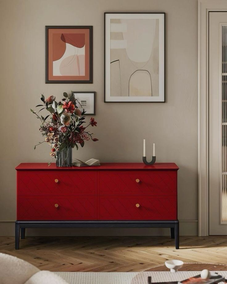 Bàn, tủ gỗ tone ấm kết hợp phụ kiện đỏ: giữ sự cân bằng thị giác